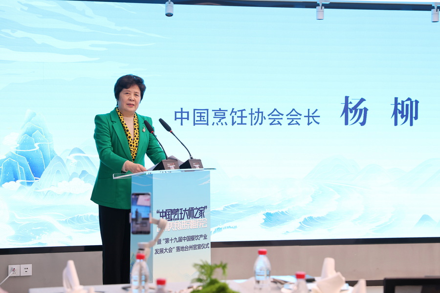 中国烹饪协会会长杨柳出席活动并致辞(中国烹饪协会供图) 杨柳在致辞中表示,2025年台州市政府积极展示台州独特的饮食魅力,多次参与中国烹饪协会举办的重要活动。其中,在台州市天台县成功举办的“2025中国台州・小吃美食嘉年华”活动成为一大亮点,通过嘉年华的舞台,让“台州小吃”成为城市文化的新名片。在中国烹饪协会的组织下,台州菜先后赴瑞士日内瓦、法国巴黎、意大利罗马参加中华美食文化展演活动;以美食为媒在国际舞台上传递中华优秀传统文化,彰显中餐的独特魅力与深厚底蕴。
