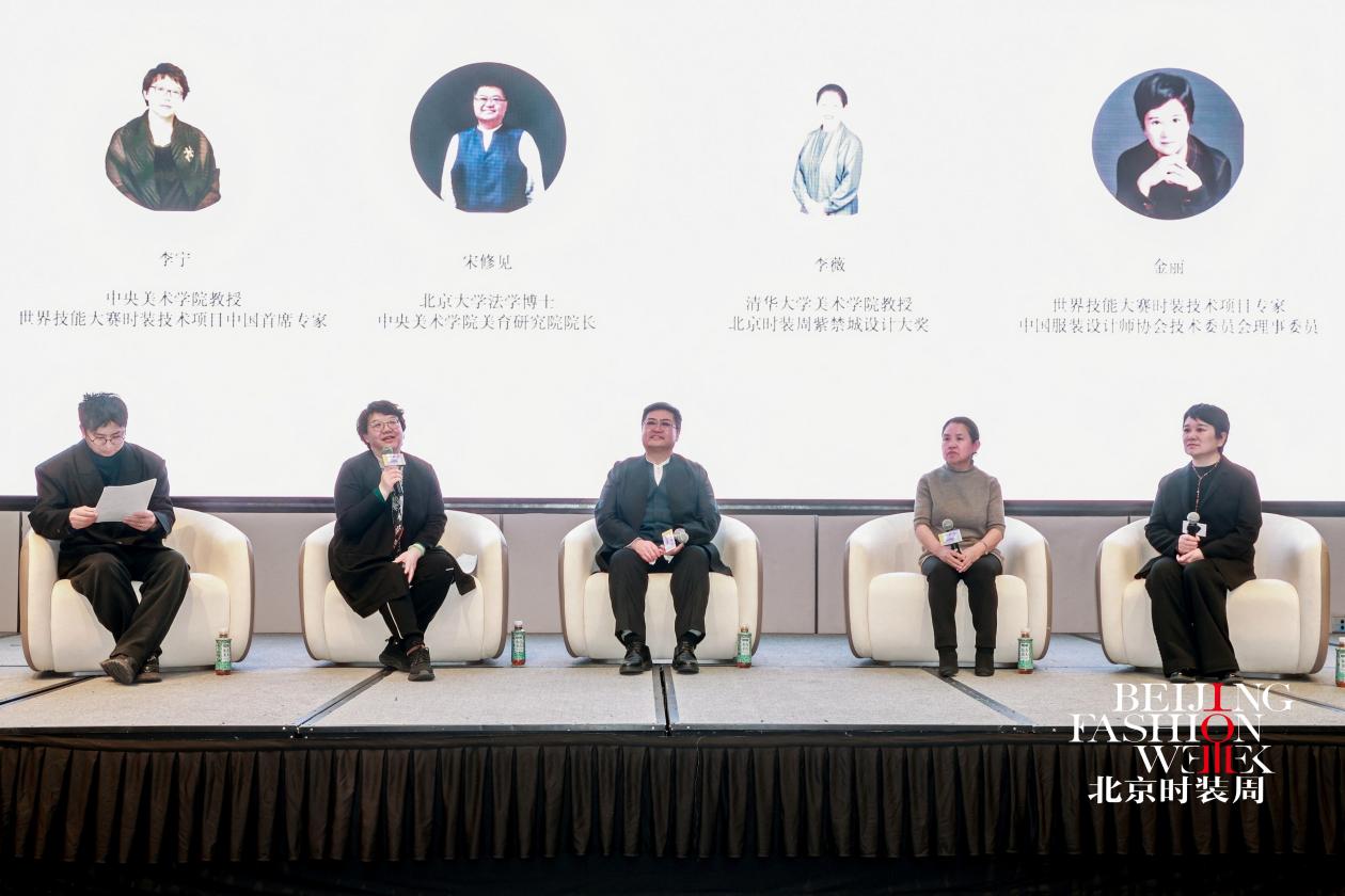 而“大师有话说”主题沙龙特邀多位重量级嘉宾出席,涵盖政府与平台领导、院校专家、世赛技术权威、品牌创始人、资深媒体主编,形成跨领域、高规格的专业对话阵容。活动现场,北京时尚控股公司董事会秘书、办公室主任,北京时装周有限责任公司董事段志强致辞,充分肯定本次活动对青年设计师扶持与时尚美育推广的重要意义。 论坛上半场以“从技术教育到审美教育的新路径”为核心,聚焦美育与时尚产业的深层联结。各方嘉宾从美育内涵、人才培养、世赛精神、技艺传承等角度,深入探讨审美教育与时装技术融合的创新路径,为时尚职业教育发展提供重要思路。下半场嘉宾从平台扶持、品牌运营、设计实战、媒体传播等维度,分享AI时代设计变革、秀场转卖场、商业化破局等实战经验,为青年设计师提供可落地的发展建议与资源方向。