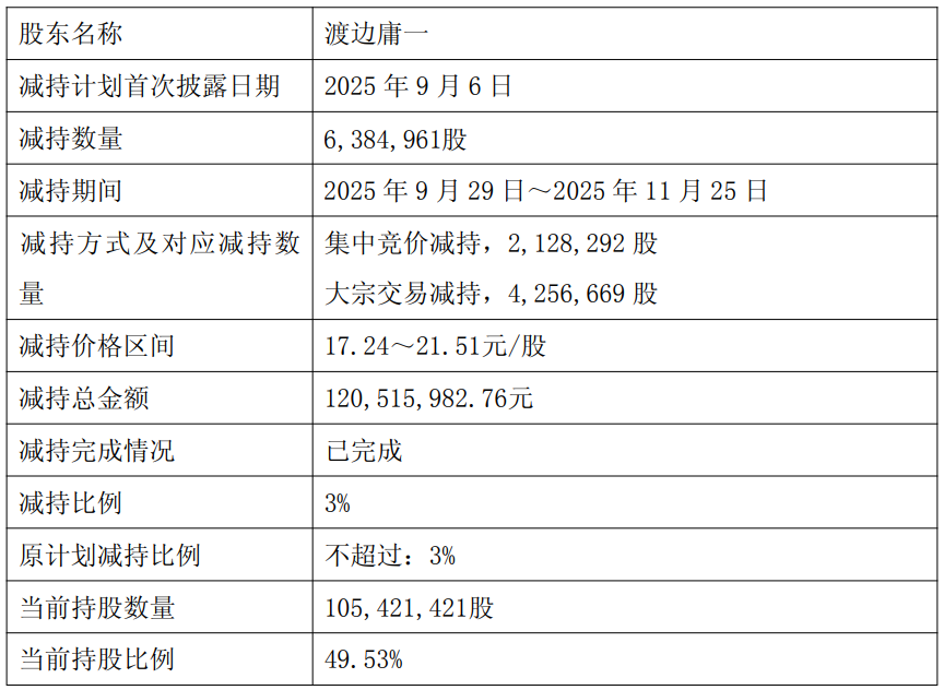 中国经济网北京3月23日讯 伟时电子(605218.SH)3月20日晚间披露控股股东及实际控制人减持股份计划公告。 因自身资金需求,公司控股股东渡边庸一计划通过集中竞价及大宗交易方式减持公司股份不超过7,284,441股,即不超过公司总股本的3%。按照公司3月20日的收盘价18.61元计算,本次套现金额约合1.36亿元。 截至公告披露日,渡边庸一持有公司股份105,421,421股,占公司总股本的43.42%,上述股份来源于公司首次公开发行前取得的股份。根据伟时电子披露的2024年年度报告,该公司控股股东、实际控制人为渡边庸一,日本国籍。 公告显示,2025年9月29日至2025年11月25日,渡边庸一减持公司6,384,961股,减持总金额为1.21亿元。