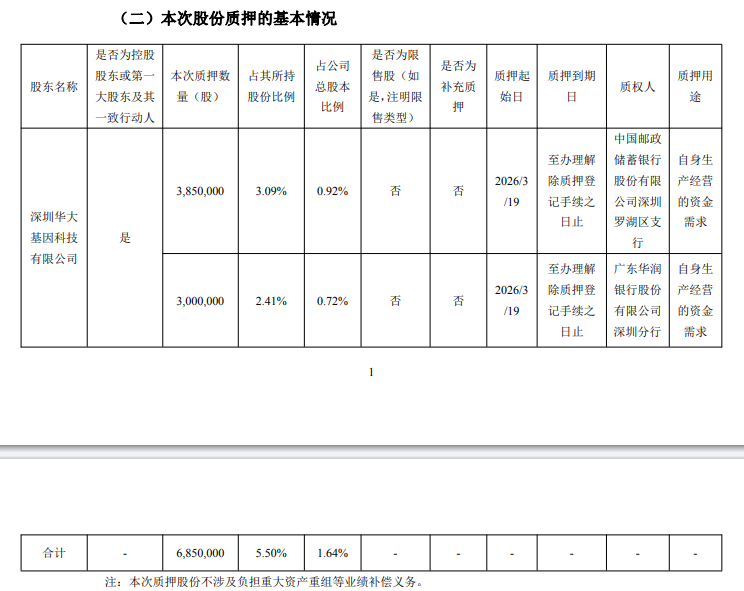 质押合计685万股,占其所持股份比例为5.50%,占公司总股本比例为1.64%,质押起始日期为2026年3月19日,质权人分别为中国邮政储蓄银行股份有限公司深圳罗湖区支行、广东华润银行股份有限公司深圳分行。