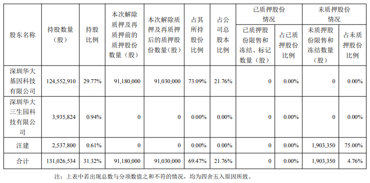 深圳华大基因科技有限公司持股1.246亿股,持股比例为29.77%,本次解除质押及再质押后的质押股份数量为9103万股,占其所持股份比例为73.09%,占公司总股本比例为21.76%。