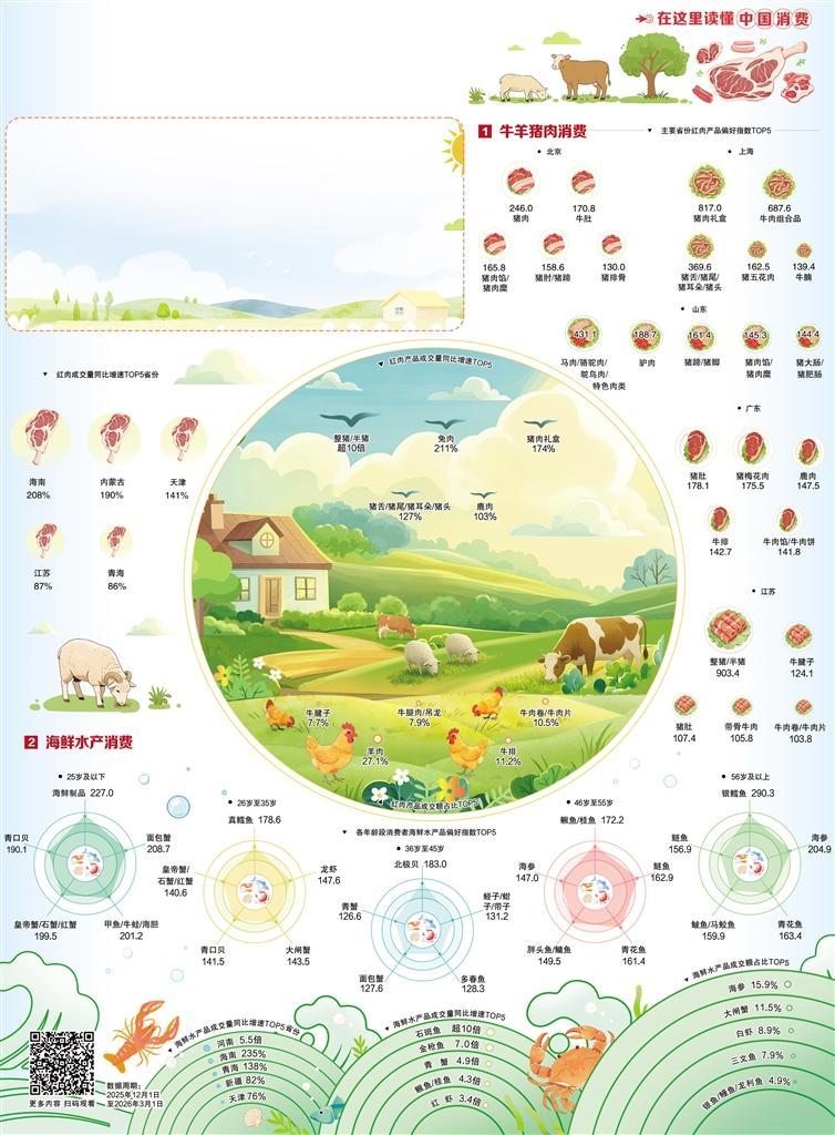 数据来源 京东消费及产业发展研究院 海参、大闸蟹占据成交额前列,整猪、兔肉成交量飙升超10倍,驴肉、鹿肉等特色肉类在山东、广东等地走俏……近期的肉类消费数据显示,当前肉类市场正呈现出“品质化、特色化、地域化”的显著特征。从单纯的“吃饱吃好”到追求“吃出品质、吃出特色、吃出健康”,肉类消费正在经历一场变革。 一方面,海参、大闸蟹等水产品持续走热,成为餐桌上的“新宠”。数据显示,海参、大闸蟹、白虾占据海鲜成交额榜单前三名,石斑鱼、金枪鱼、青蟹等高价值水产品成交量同比分别增长超10倍、7倍和4.9倍。不同年龄段消费者的偏好也日趋分化:25岁及以下的消费者偏爱面包蟹、甲鱼等新奇品类;26岁至35岁的消费者青睐龙虾、大闸蟹等“轻奢”食材;56岁及以上人群偏好银鳕鱼、海参等高营养价值滋补类产品。海鲜消费正从“节庆专属”走向“日常分层”,成为不同年龄段消费者品质生活的外在表达。 另一方面,红肉消费呈现出“囤货+尝鲜”双轮驱动。从成交量增速看,整猪/半猪成交量超10倍,猪肉礼盒增长174%,反映出家庭囤货需求和节日礼赠场景的叠加。同时,兔肉、鹿肉等特色肉类增速分别达211%和103%,消费者尝鲜意愿强烈。从地域偏好看,北京消费者偏爱猪肉类产品,上海以猪肉礼盒、牛肉组合品遥遥领先,江苏热衷整猪/半猪,广东青睐猪肚、猪梅花肉,山东消费者偏好驴肉、马肉等特色肉类。地方饮食文化的多元延展,正在重塑红肉消费的地域版图。 此外,中西部地区及部分沿海省份正成为肉类消费的新增长极。海南、内蒙古、天津的红肉成交量同比分别增长208%、190%和141%。河南的海鲜成交量增长5.5倍,海南、青海、新疆等地增速也同样亮眼。肉类消费的区域边界正在被打破,全国统一大市场的活力持续释放。 从整猪囤货到海参上桌,从本地偏好到跨域尝鲜,肉类消费既有传统年节的温馨热闹,又有品质生活的全新表达。新旧交融、城乡共进的肉类消费趋势,映照着烟火气里不断升级的美好生活。